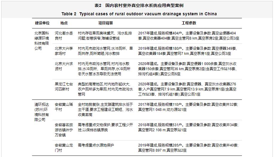 经过近20年的探索与实践,国内在室外真空排水系统应用方面形成了一批具有核心技术装备的环保企业,如万若(北京)环境工程技术有限公司、湖南真创环保科技有限公司、北京国科绿源环境科技有限公司、山东中车华腾环保科技有限公司、清环拓达(苏州)环境科技有限公司等,其在国内自主研发真空排水技术及设备方面处于领跑地位,并在我国农村生活污水治理中开展了大量的工程应用。2004年,国内首次将室外真空排水系统应用于上海国际赛车场厕所污水收集项目中[26],后续逐步应用至别墅区、景区[27];从2014年开始,真空排水系统逐步在农村生活污水治理项目中得到大规模应用,主要分布在江苏、浙江、安徽、天津、北京、黑龙江等省(市)(表2)。其中,我国规模最大的农村真空负压排水集中处理系统工程位于天津宁河区七里海保护区,该工程于2020年开始建设,惠及造甲镇、东棘坨镇、俵口镇、廉庄镇4个镇27个村共14 115户村民。