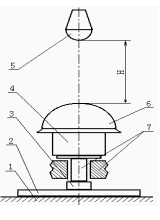 1- 混凝土基座;2-底座;3-压电式传感器;4-头模;5-钢锤;6-安全帽;7-力传感器配套装置;H-冲击距离