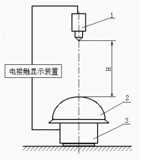 试验示意图见图10所示,将一顶完好的安全帽安放在头模上,安全帽衬垫与头模之间放置电接触显示装置的一个电极,该电极由铜片或铝片制成,如钢锥与该电极相接触,可形成一个电闭合回路。电接触显示装置会有指示。用3kg的钢锥从1m高度自由或导向下落穿刺安全帽,钢锥着帽点应在帽顶中心φ100mm范围内的薄弱部分,穿刺后观察电接触显示装置,如无显示,则试验通过。
