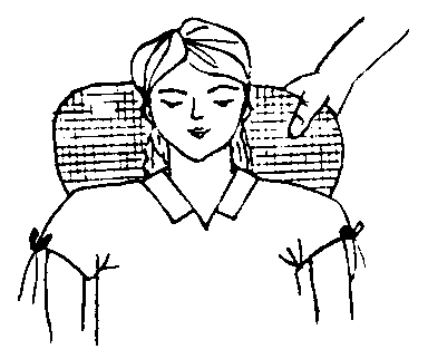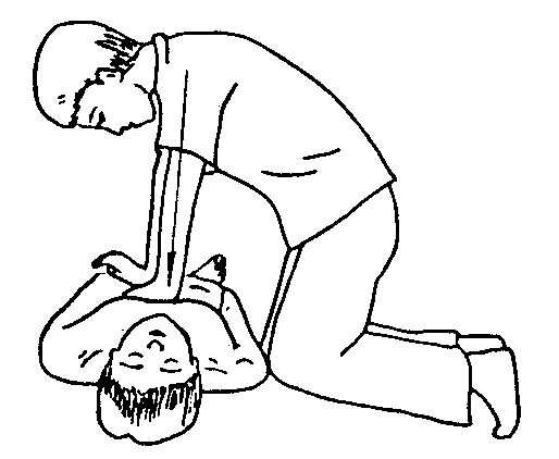 3.3.2 疑有颈椎损伤,在使伤员平卧后,用沙土袋(或其它代替物)放置头部两侧(图12)使颈部固定不动。必须进行口对口呼吸时,只能采用抬颏使气道通畅,不能再将头部后仰移动或转动头部,以免引起截瘫或死亡。