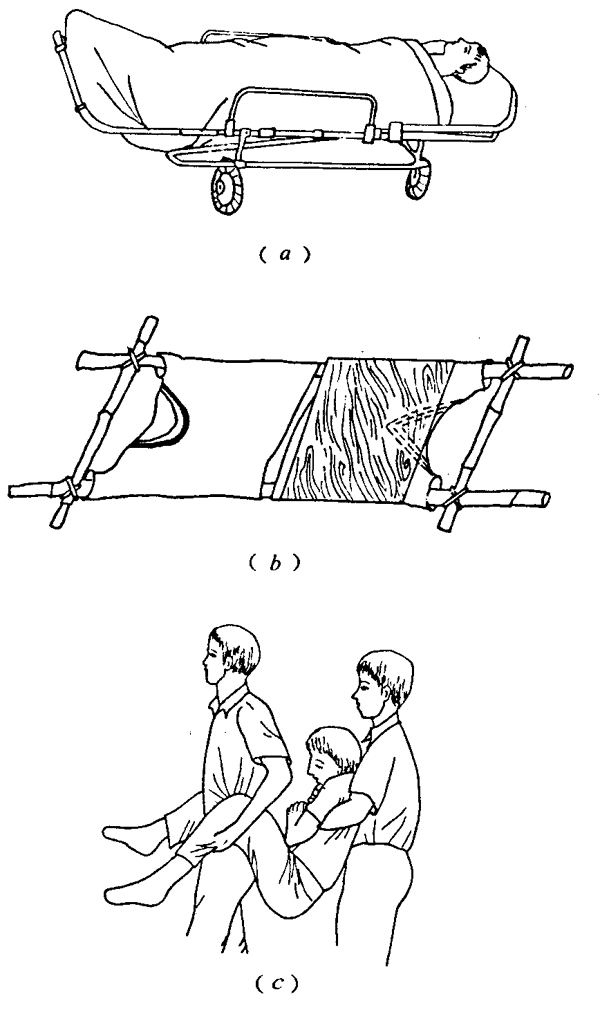 (a)正常担架;(b)临时担架及木板;(c)错误搬运
