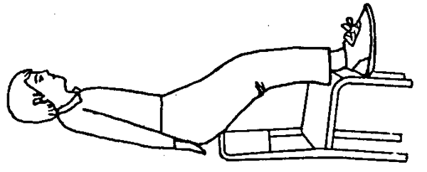 3.2.4 高处坠落、撞击、挤压可能有胸腹内脏破裂出血。受伤者外观无出血,但常表现面色苍白、脉搏细弱、气促、冷汗淋淳、四肢厥冷、烦躁不安、甚至神志不清等休克状态,应迅速躺平,抬高下肢(图10),保持温暖,速送医院救治。若送院途中时间较长,可给伤员饮用少量糖盐水。