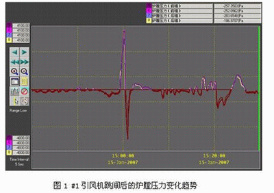 2007年1月15日,在机组整套启动期间,由于电气方面的原因,#1引风机突然跳闸,由此引起了炉膛压力的急剧变化,并导致了炉膛压力主保护动作,触发了锅炉跳闸,锅炉跳闸又联跳了汽机。事故过程的炉膛压力变化趋势如图1所示。